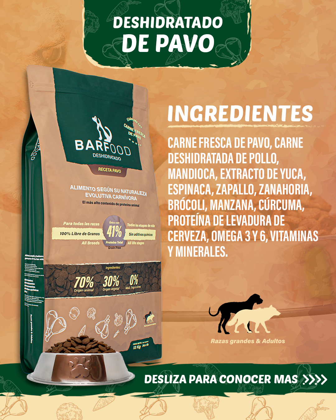 Alimento deshidratado para perros, hecho con carne fresca de pavo como primer ingrediente, sin granos y sin aditivos.